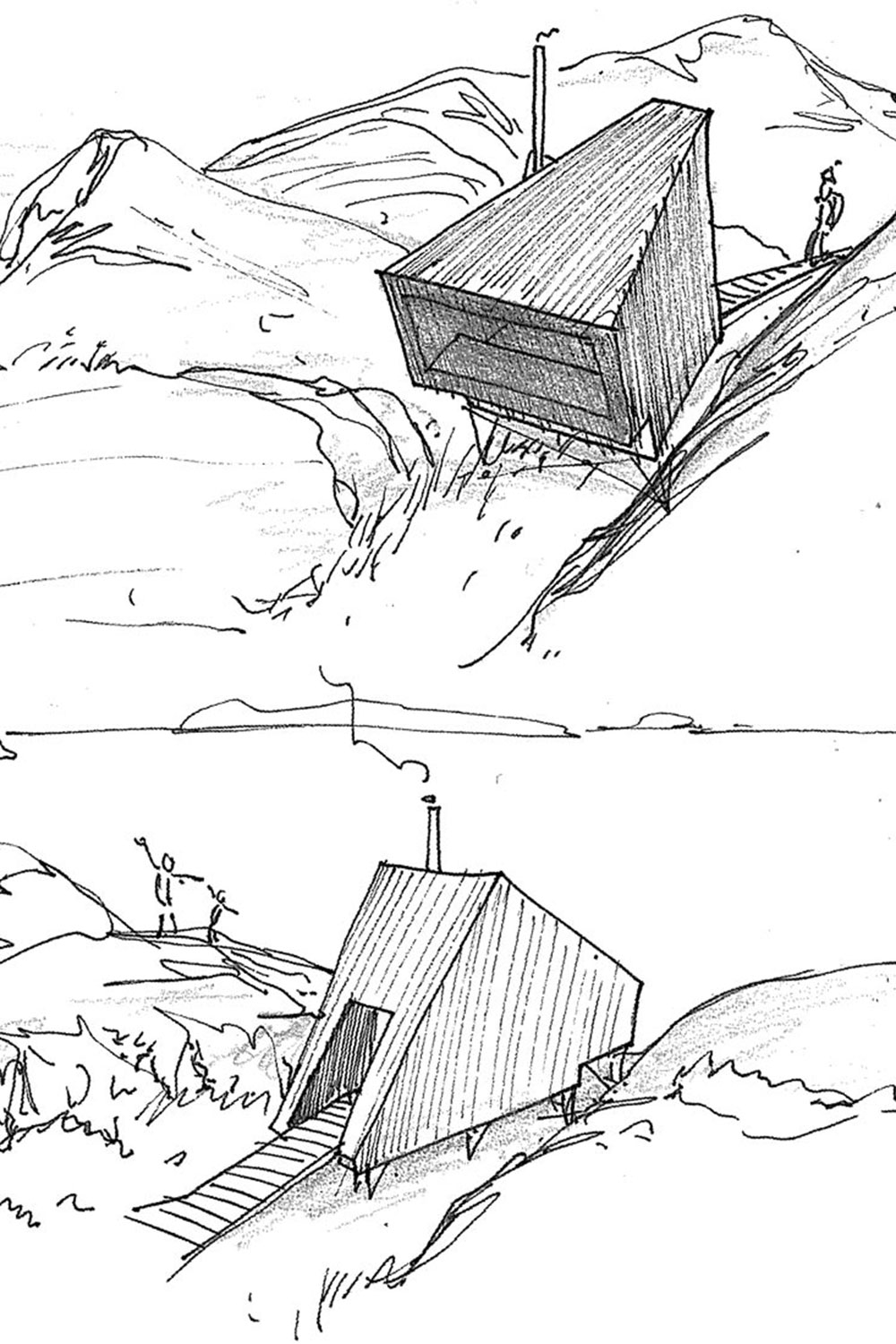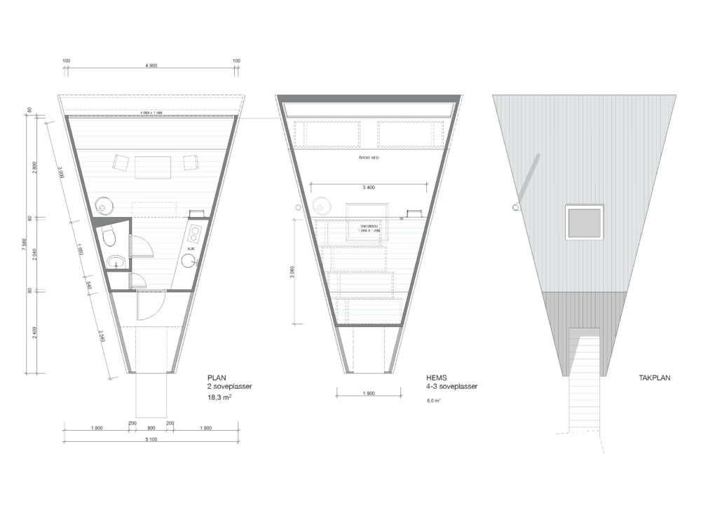 Flokehyttene er trekantet både i plan og profil. Formen ga seg etter en syntese av landskapshensyn, ønsket om gode rom, samt krav til stabilitet i et ytterst barskt klima.