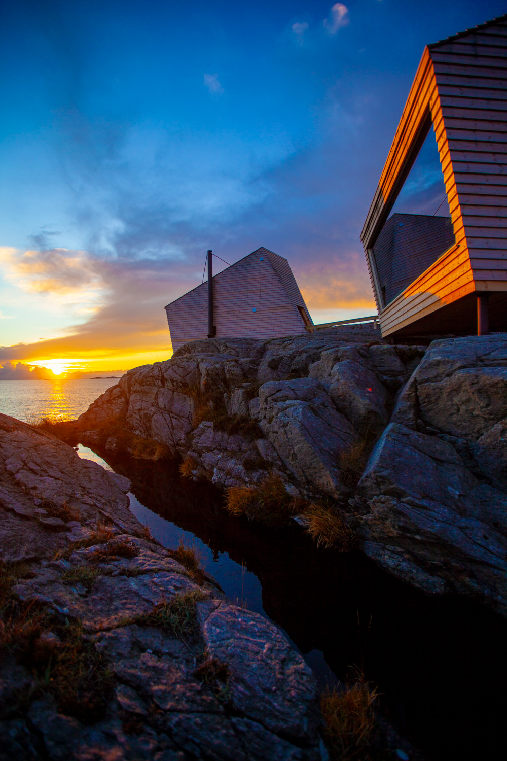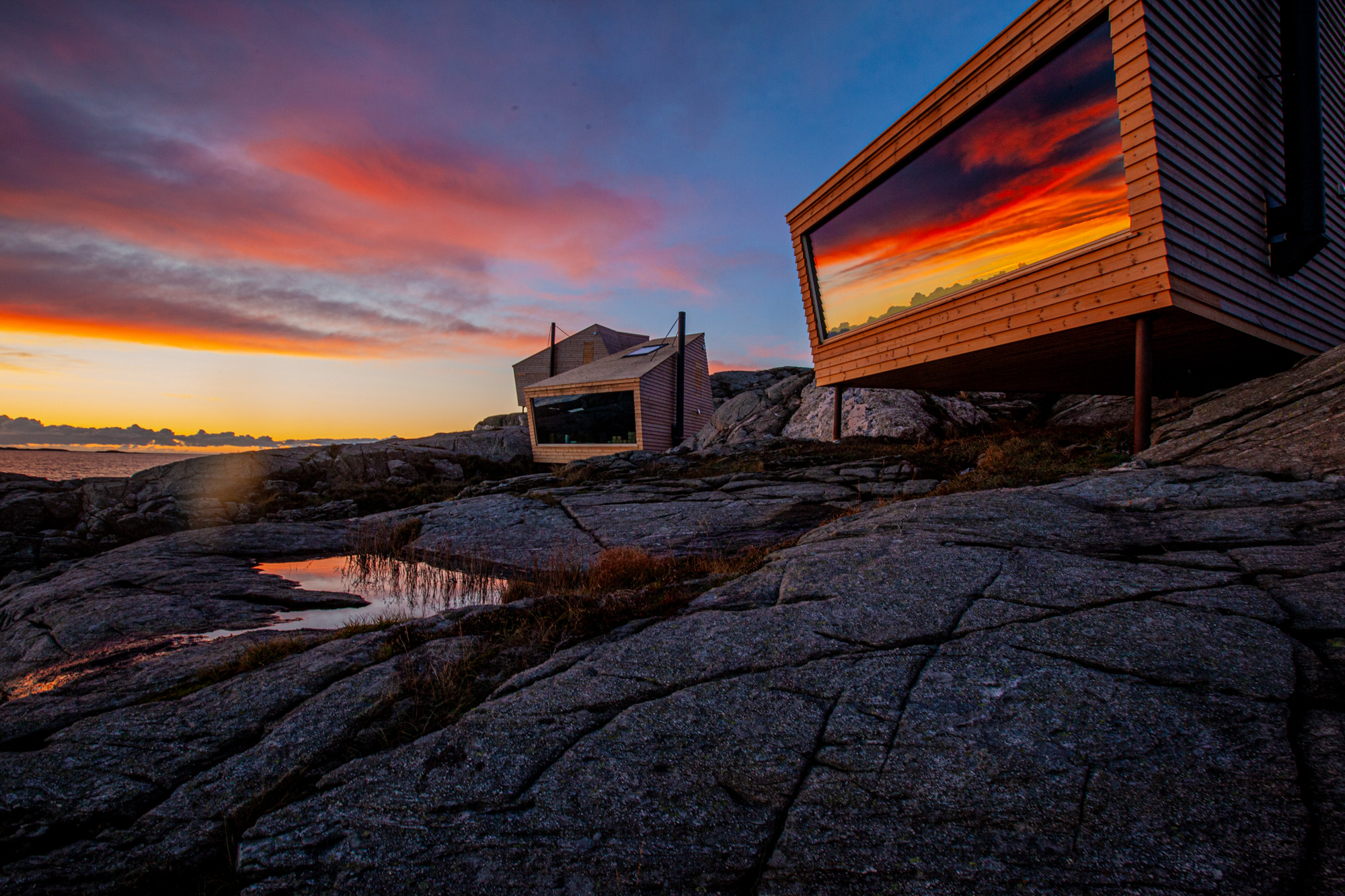 Det var et uttrykt ønske fra oppdragsgiverne at hyttene ikke skulle sette varige spor i landskapet. Dette innebar at det verken kunne sprenges, fylles, grøftes eller planeres. Knauslandskapet ikke privatiseres og okkuperes av et hyttefelt. Hyttene måtte derfor ikke være vanlige bygg, men objekt sydd inn i landskapet. Fra tilkomsten ved Ryvarden kulturfyr fremstår Flokehyttene som små, smale utsiktstårn langs klippenes brystvern mot havet.