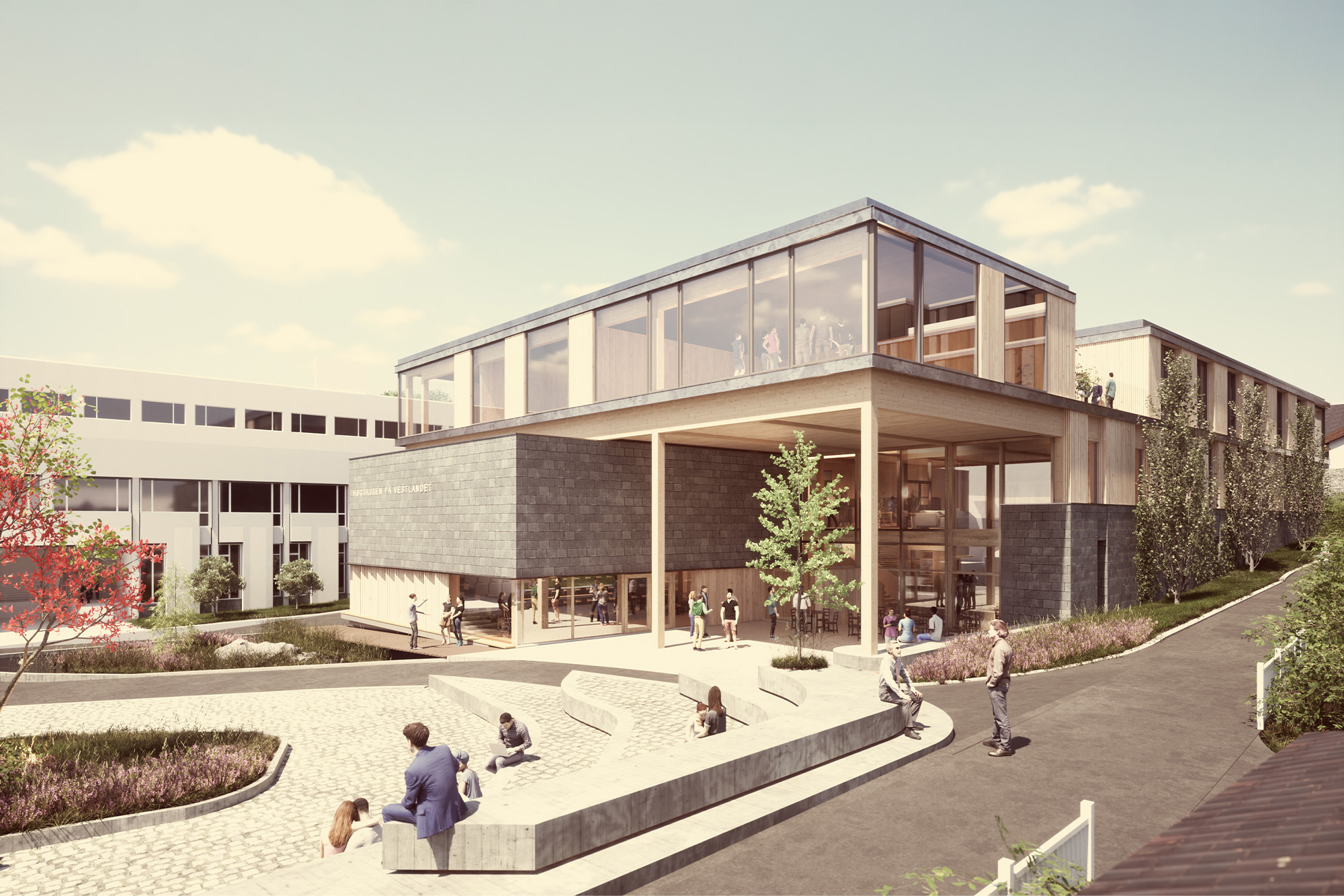 Vi ønsker å skape en høyskole som er inkluderende internt og eksternt i møte med øvrige faginstanser og næringsliv. Prosjektet er inviterende mot omgivelsene og åpner seg opp mot gaten. Det nye byrommet kan brukes av alle og introduserer sentrumsstrukturen.