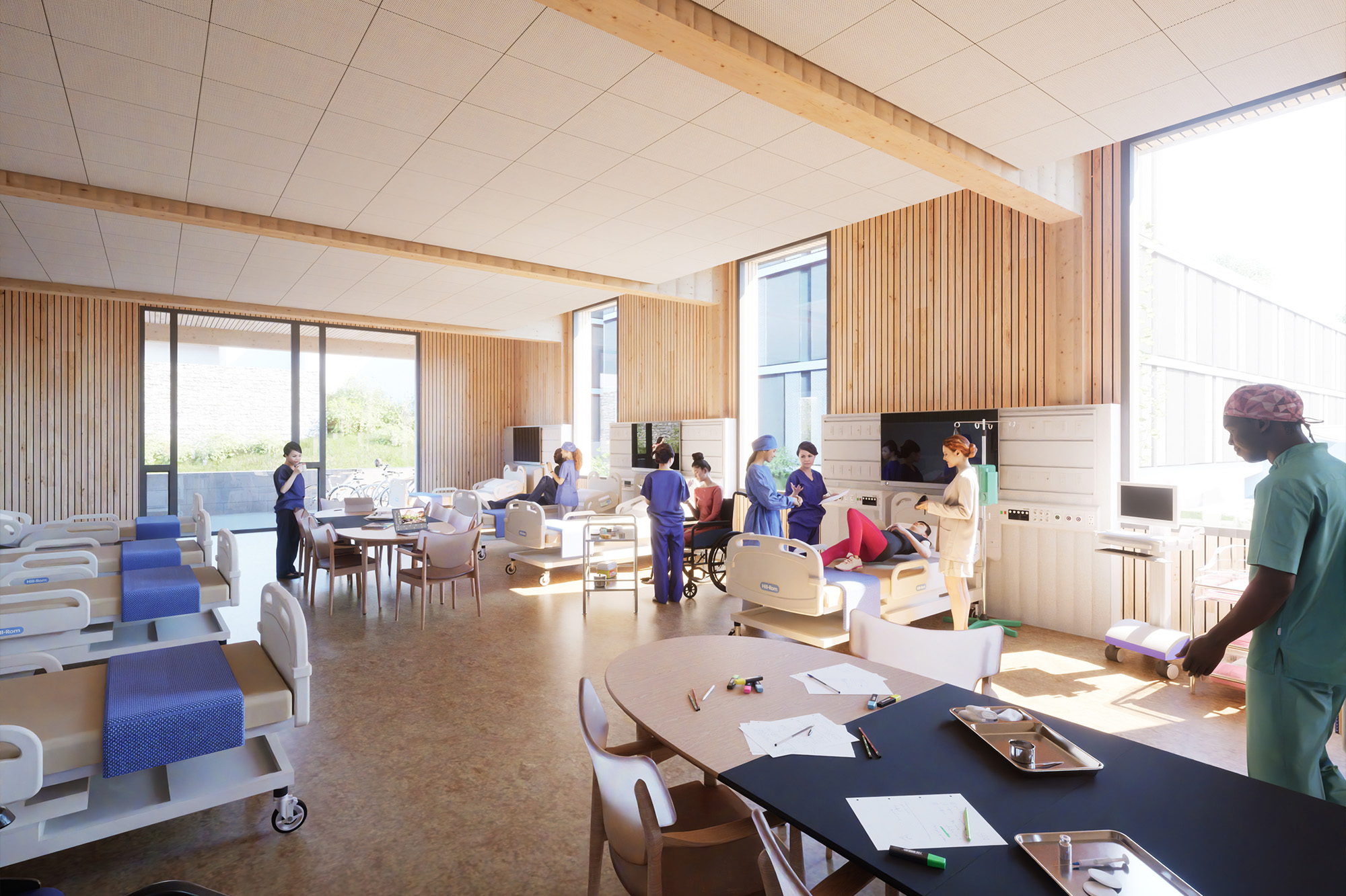 Nybygget på HVL Campus Haugesund, kalt Simuleringsbygget, er et moderne undervisnings- og administrasjonsbygg på 4500m2. Det bygges i bærekraftige materialer, og klassifiseres som Passivhus. Bygget kobles sammen med eksisterende skolebygg via en bro. Energisentralen i den nye bygget skal også forsyne eksisterende bygg.
