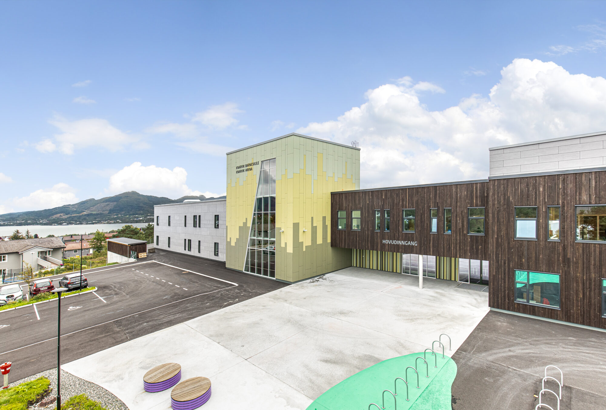 Skolens design er fremtidsrettet, med flere adkomstmuligheter på bakkeplan, noe som gir en fleksibilitet som kan tilpasses skiftende behov over tid. Denne fleksibiliteten er ikke bare viktig for dagens brukere, men sikrer også at skolen kan tilpasses nye funksjoner eller utvides i fremtiden uten store endringer i byggets struktur. Den arkitektoniske løsningen gjør det mulig å kombinere ulike virksomheter samtidig, noe som styrker skolens posisjon som et sentralt samlingspunkt i Knarvik.