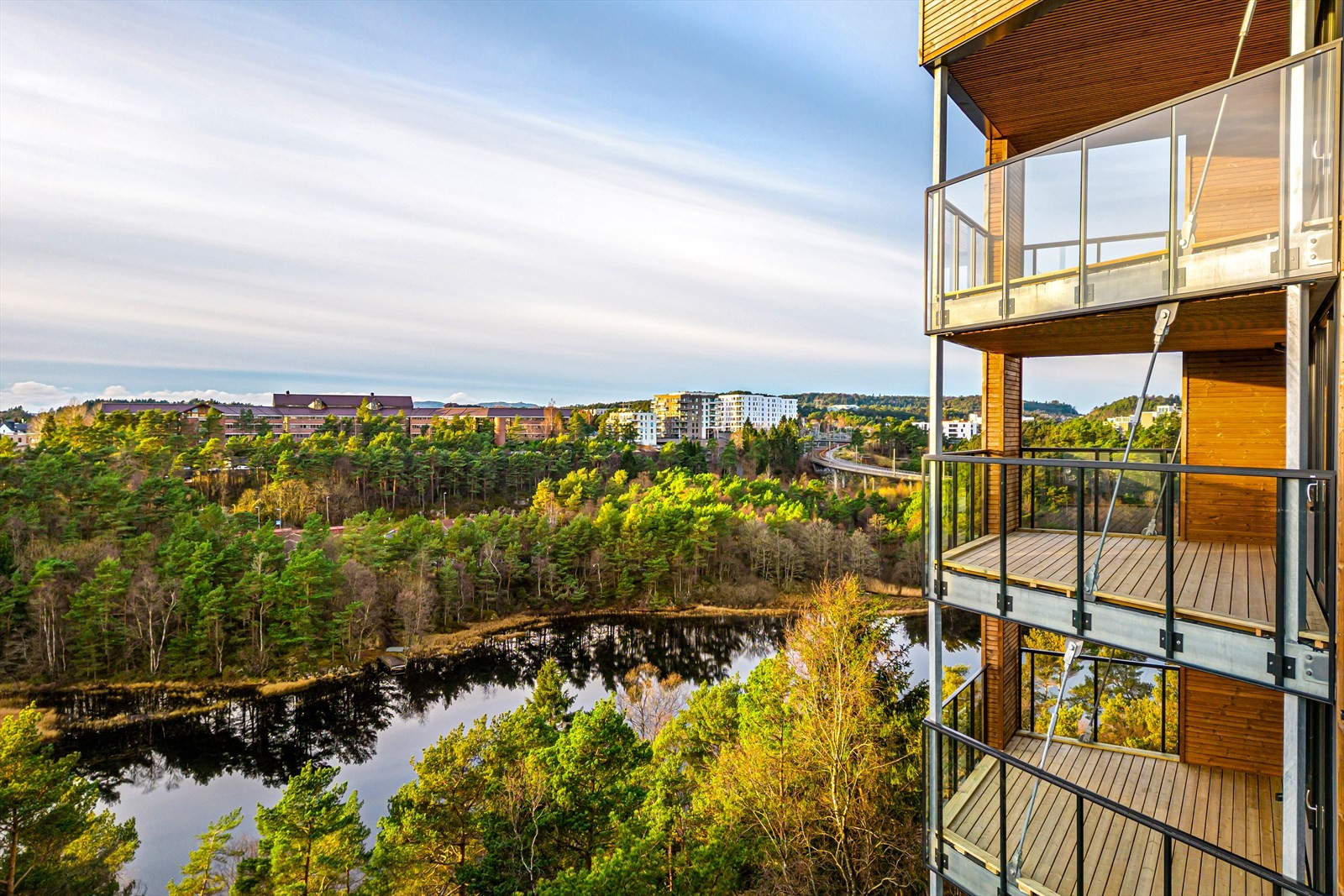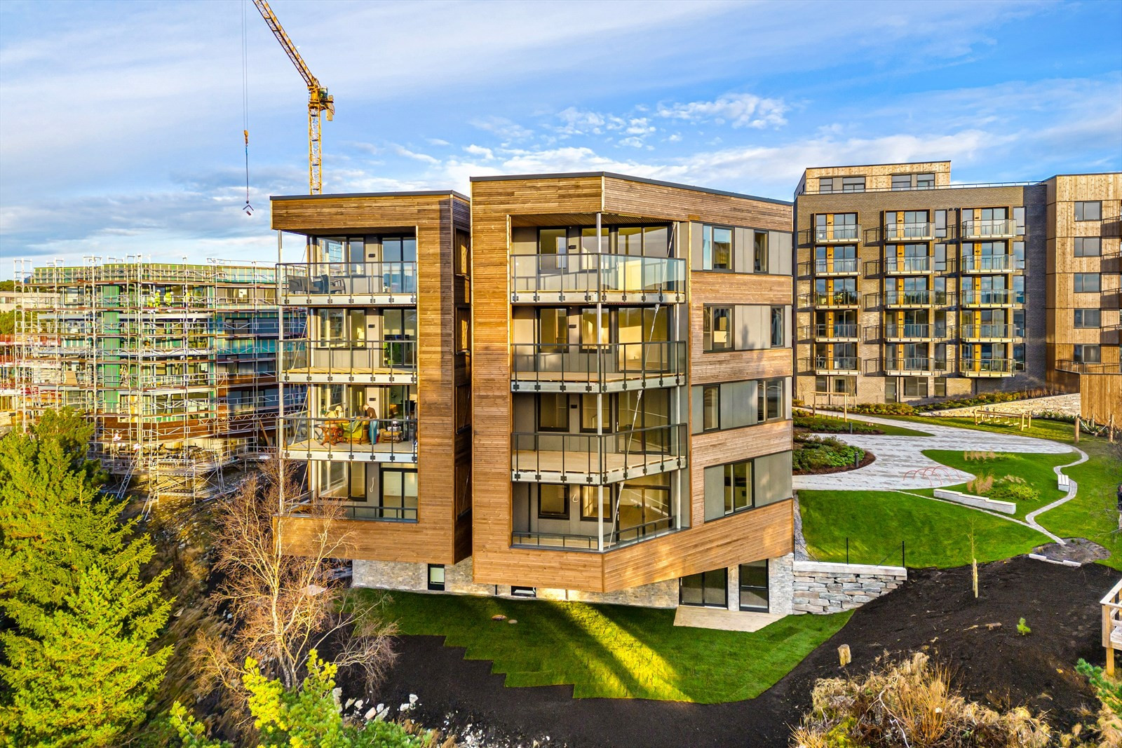 Høydevariasjonen i byggene, som spenner fra fire til syv etasjer, er nøye tilpasset tomtens skrånende terreng. Dette sikrer at bygningene ikke dominerer landskapet, men heller fremhever de naturlige siktlinjene mot Håvardstunvatnet og områdene rundt. Den gradvise oppbyggingen mot gaten Sandsliåsen gir prosjektet et bymessig preg, med fokus på levende fasader og integrerte balkonger som gir liv til bygningenes uttrykk.