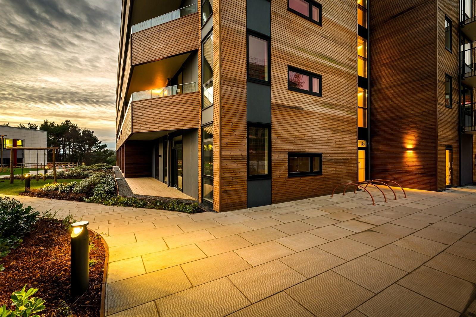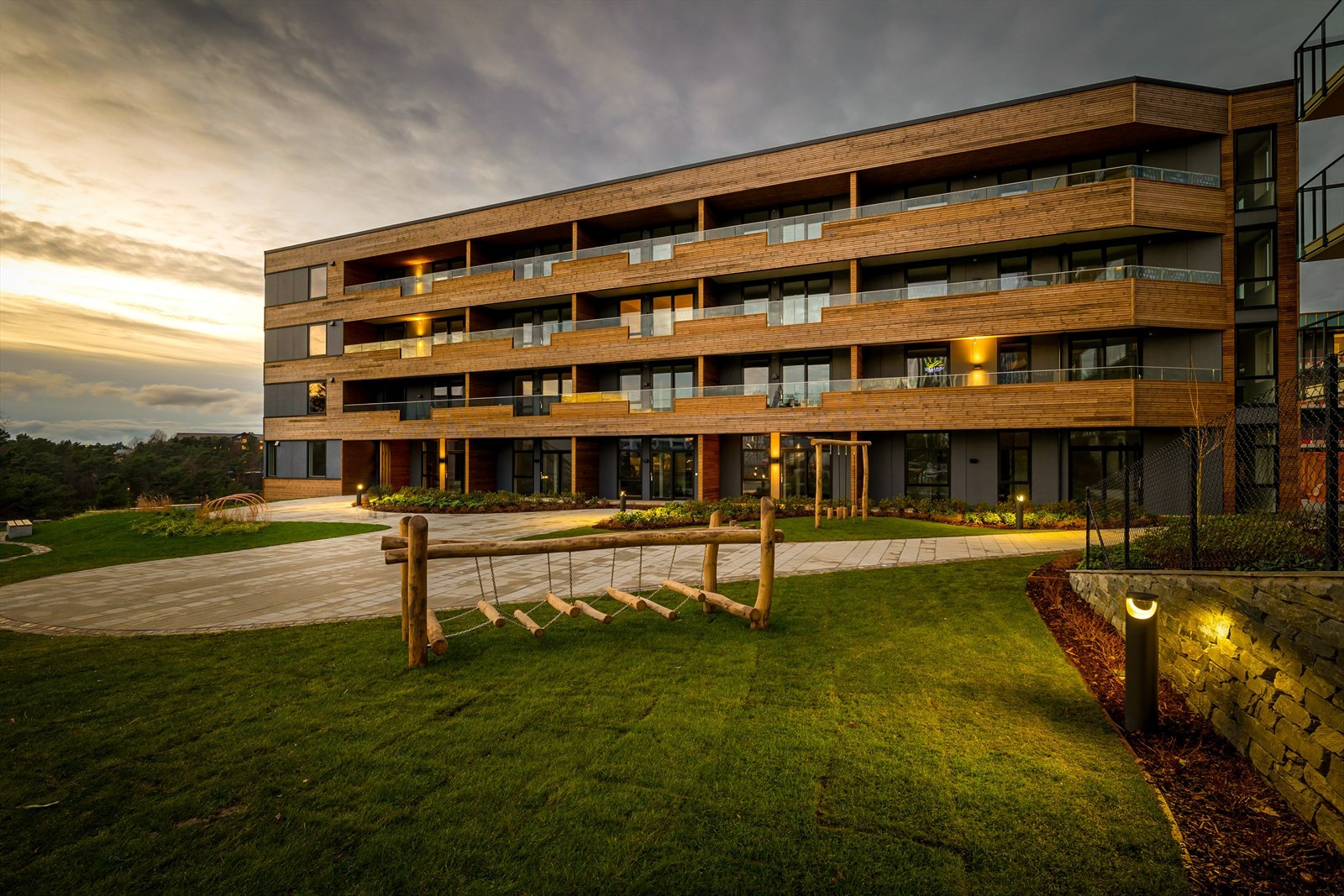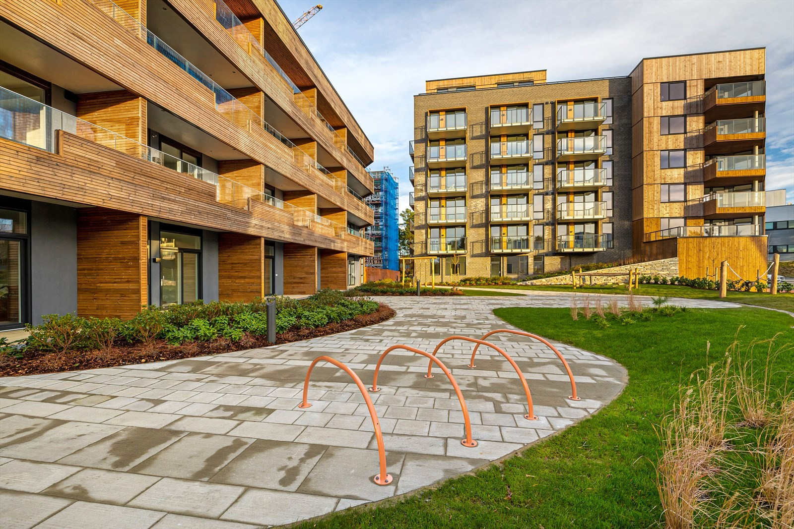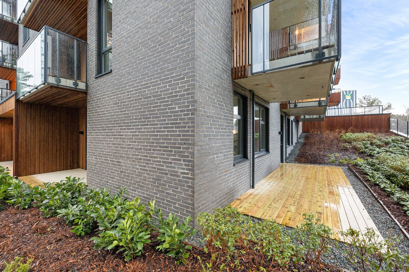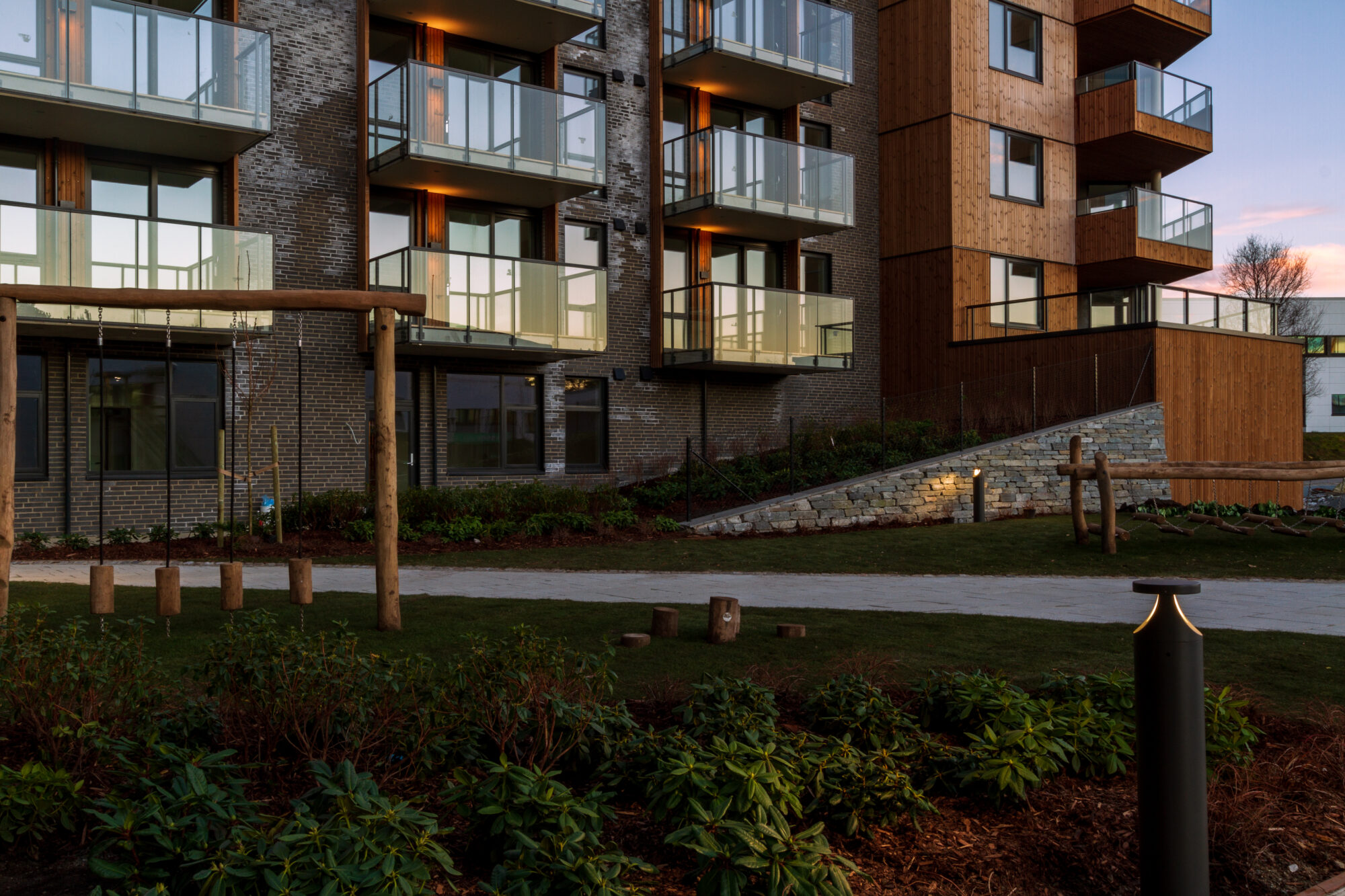 Balkongene er integrert i fasaden for å unngå påhengte elementer, noe som gir byggene et rent og moderne utseende. Denne tilnærmingen fremmer en visuell kontinuitet og sikrer at bygningene oppleves som en naturlig del av landskapet.