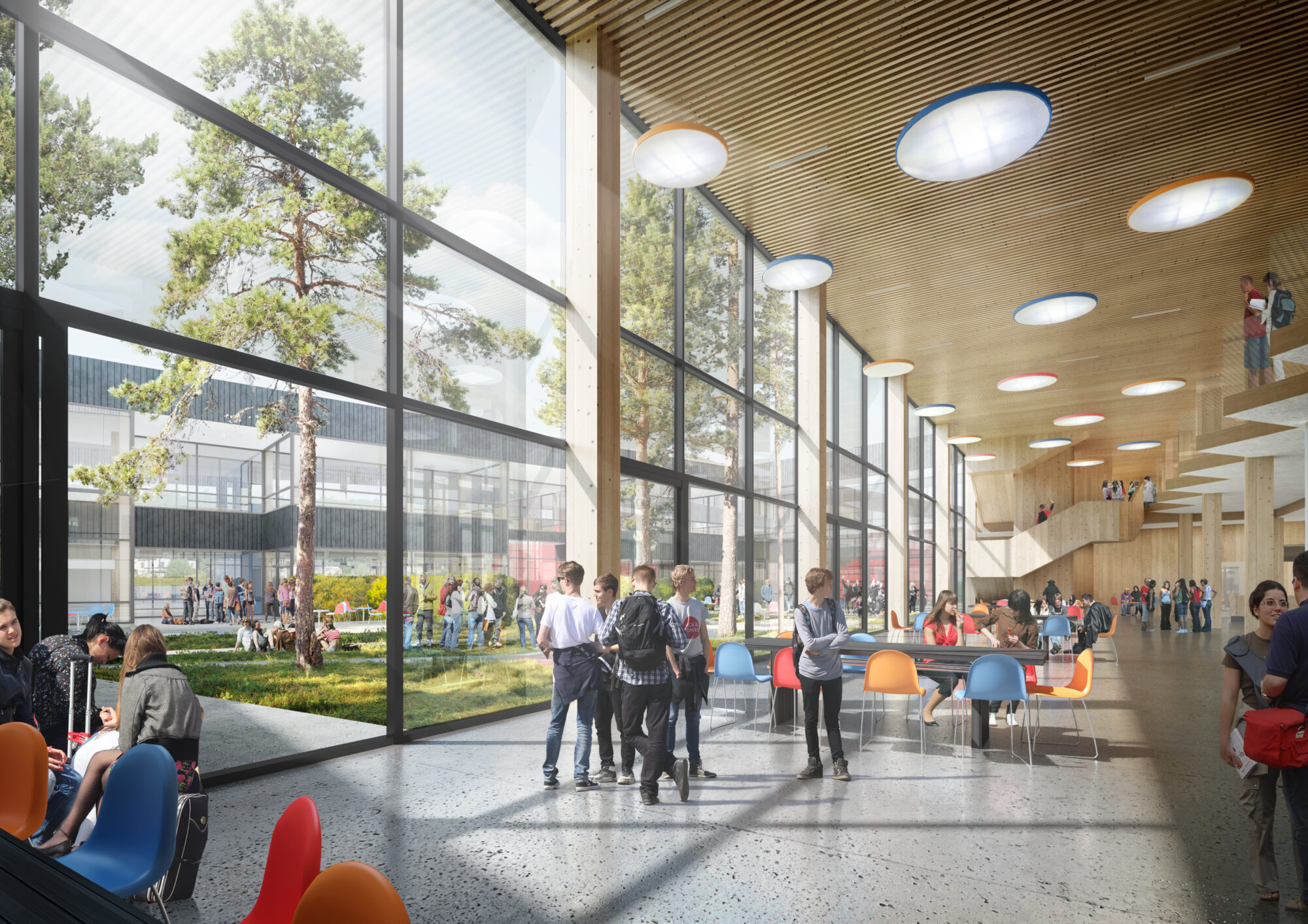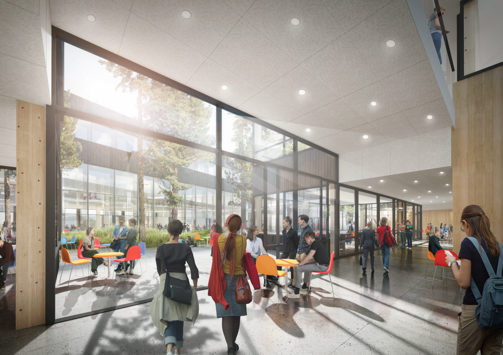 Skolens hjerte er kantinen med spiseplasser, sosiale soner, vrimleareal, bibliotek og kjøkken.