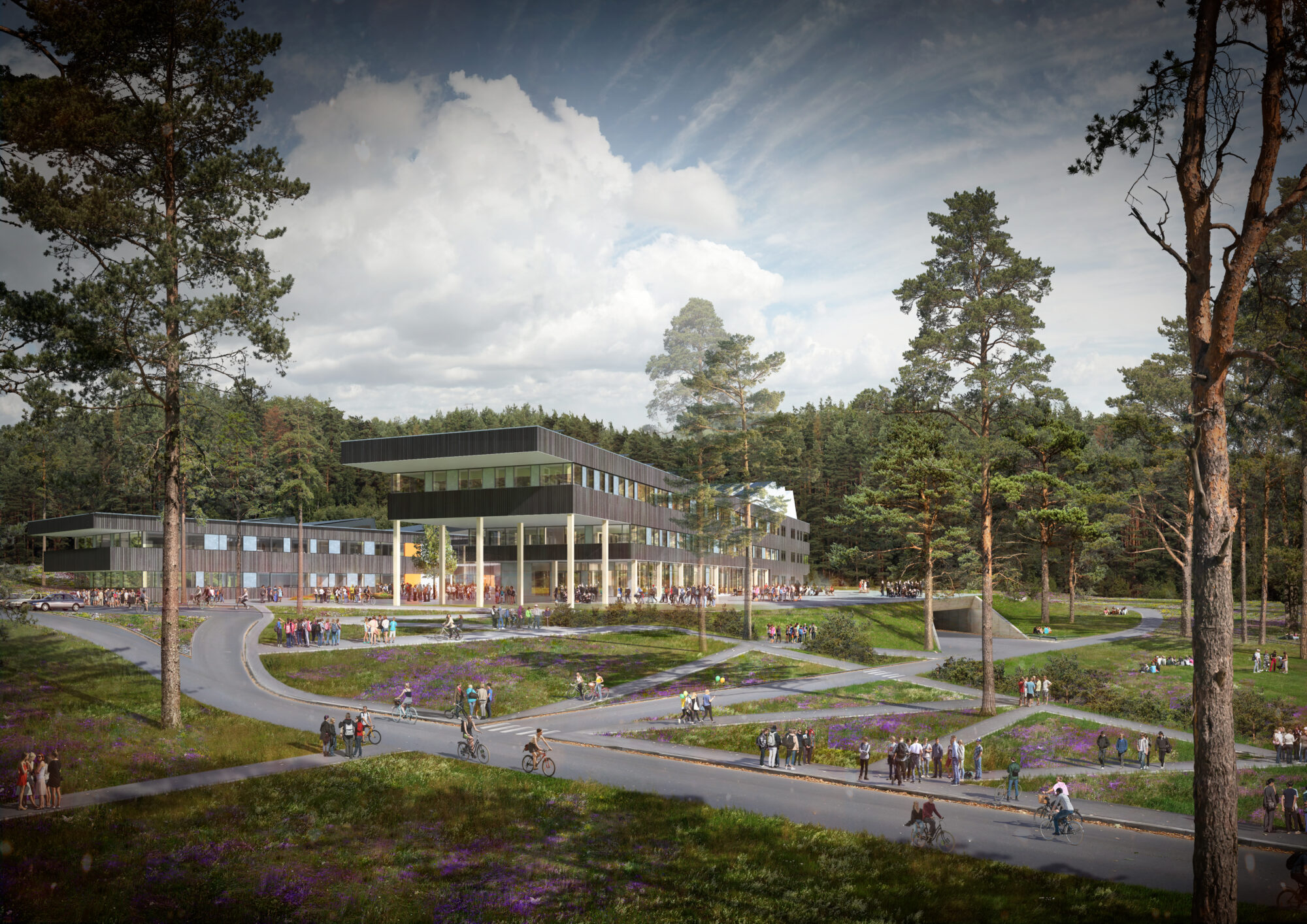 Konseptet har A-form med «spissen» og den minst aktive sonen vendt mot nord og en kolle. Slik ledes bevegelse med gange/sykkel fra nord og øst forbi bygget uten at det fremstår som en stengsel opplevelsesmessig og visuelt.