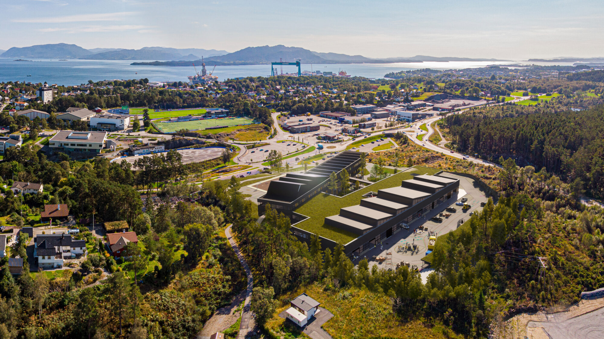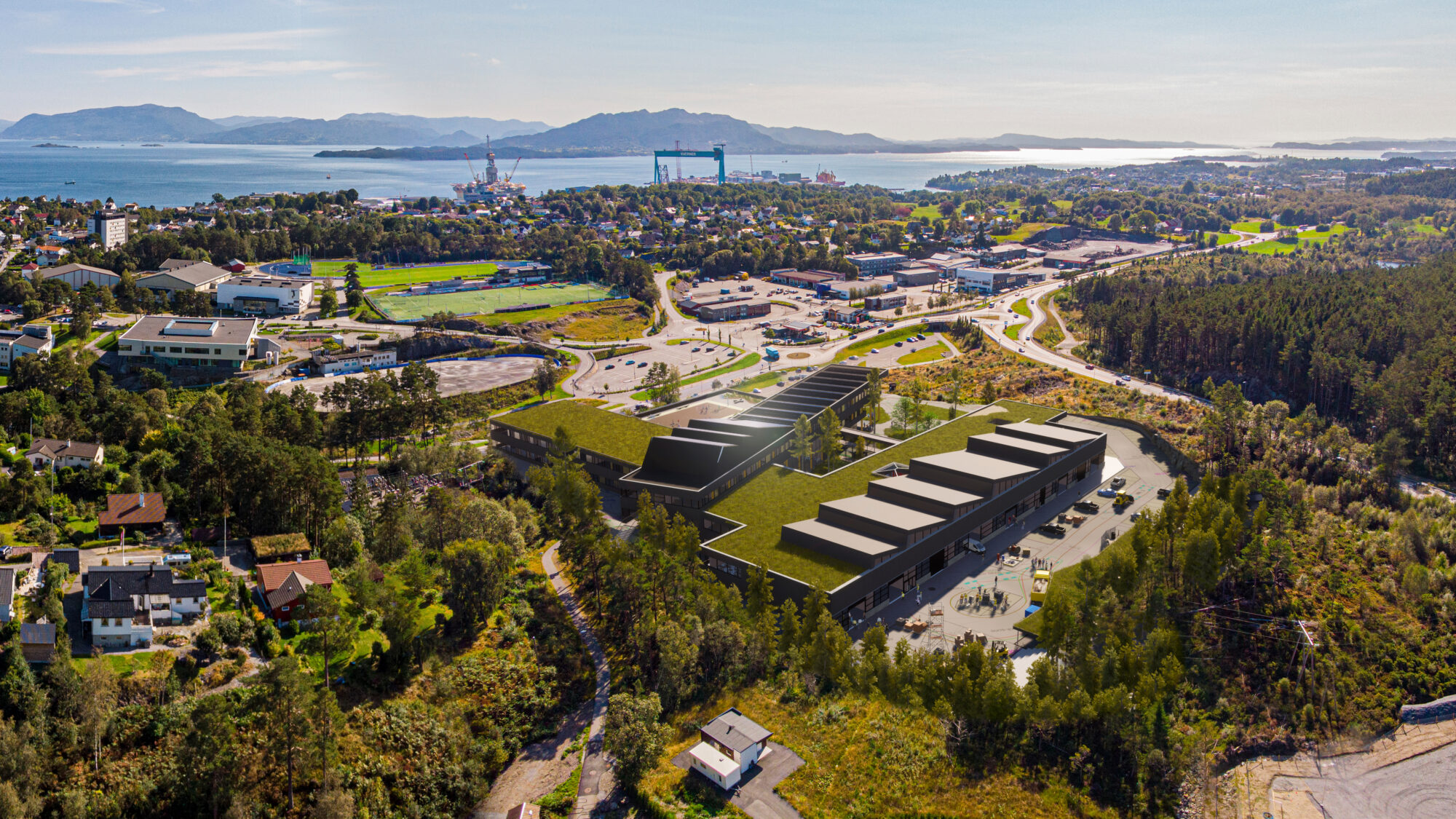 Denne konteksten vil oppleves også fra tilkomst, skolegård og overliggende etasjer. I tillegg vil traverskranen til Kverner, boreplattformer og fjelltoppene i Sunnhordalandsbassenget skimtes. På illustrasjonen ser vi nærmest Trollevassnibba i Sveio og lengst ute Grohorga i Vindafjord foran Etnefjellene.