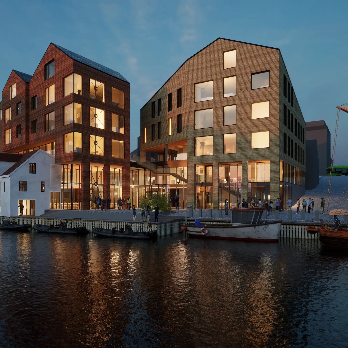 I de øvrige fire etasjene, er det foreslått 3 punkthus organisert rundt et skjermet byrom og felles gårdshage mot øst. Med sin mer fragmenterte form skaper de siktlinjer mellom byen og sundet, samt at de sørger for optimale lysforhold. Disse skaper en ny silhuett mot sundet, med sin moderne tolkning av den tradisjonelle sjøhusbebyggelsen. Disse er tenkt bygget i massivtre, og skal kunne romme alt fra servicefunksjoner, kultur, kontor og boliger. Byggene skal imøtekomme bærekraftige prinsipper for moderne byggteknikk og har en målsetting om BREEAM excellent sertifisering.