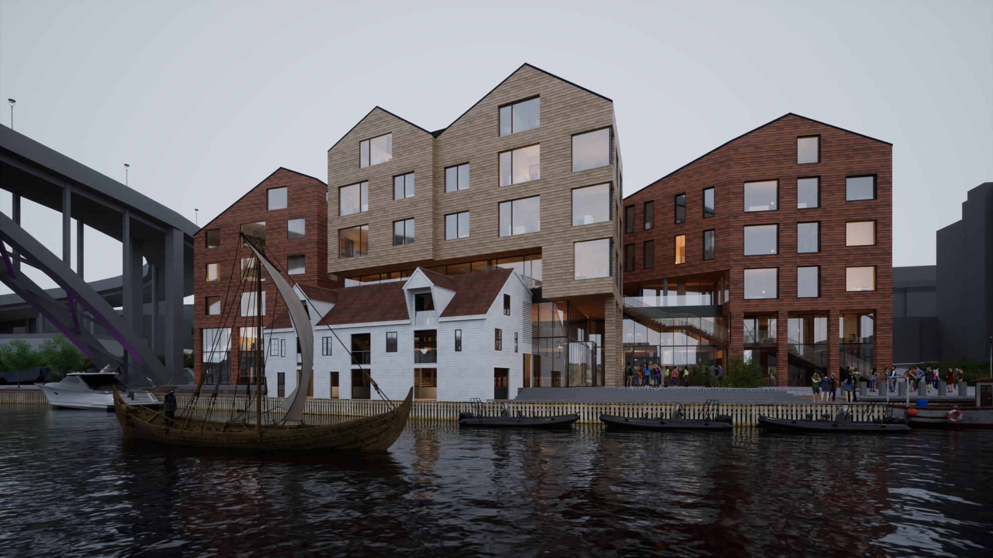 Oppgaven var å transformere eksisterende bebyggelse sammensatt av enkelstående hus, sjøhus, lavblokk og lagerbygninger, til et 3-ganger så stort romprogram innenfor eksisterende byggelinjer. Eiendommen ligger i et bykvartal med stor terrengforskjell og tett bebyggelse, med en komplisert infrastruktur tett opp til byens viktigste byrom, kaipromenaden.Vårt forslag, «Brufjord», fokuserer på fleksible forbindelser og attraktive plassdannelser på alle nivåer rundt bygningsmassen. Ved å tilrettelegge for aktive arealer mot terreng der hvor mennesker ferdes, viskes skillet mellom ute- og inne-rom bort, og sørger for en mer fleksibel bruk av arealene inne. Attraktive, ekstroverte utleielokaler i de to første etasjene åpner seg ut mot havnepromenaden, og vil kunne styrke byrommet og åpne opp for flere gode møtesteder.