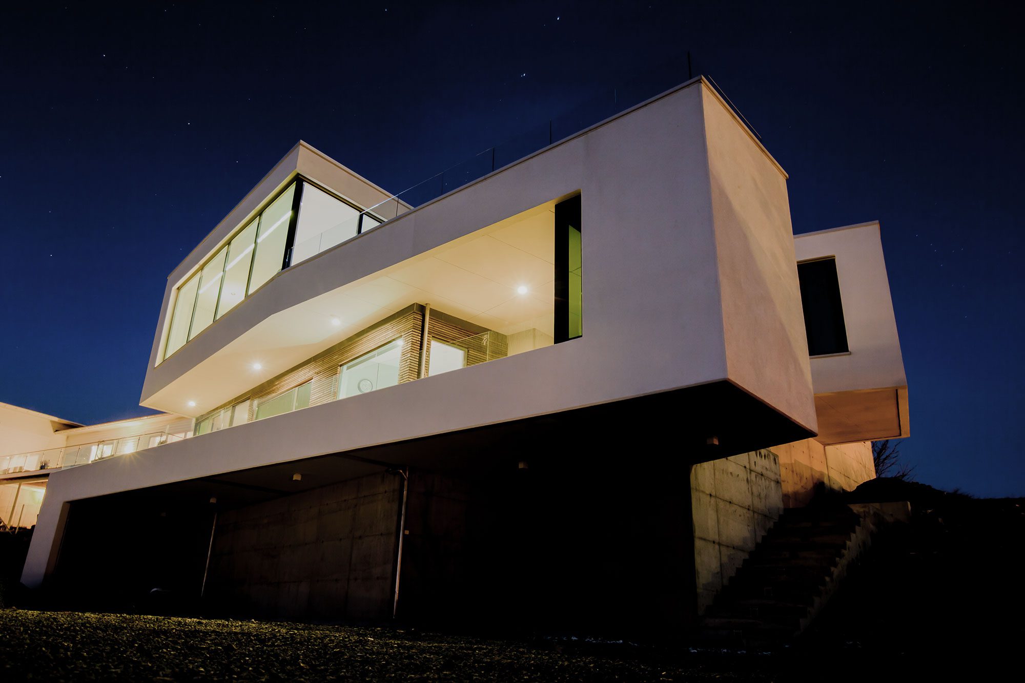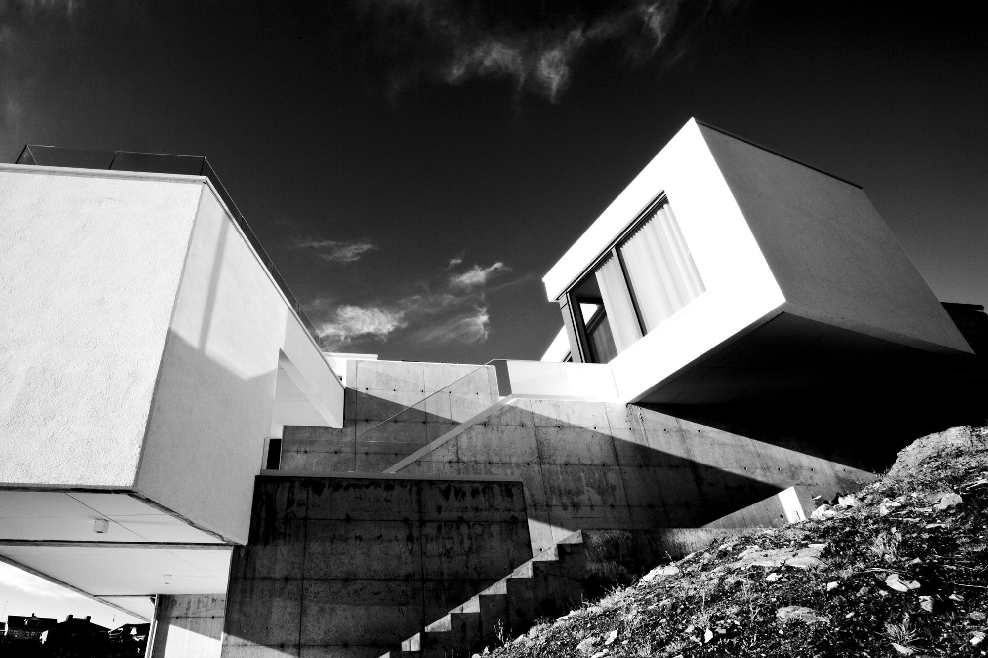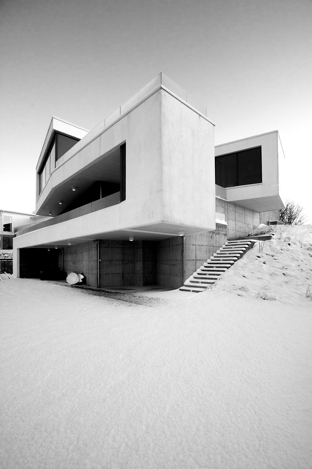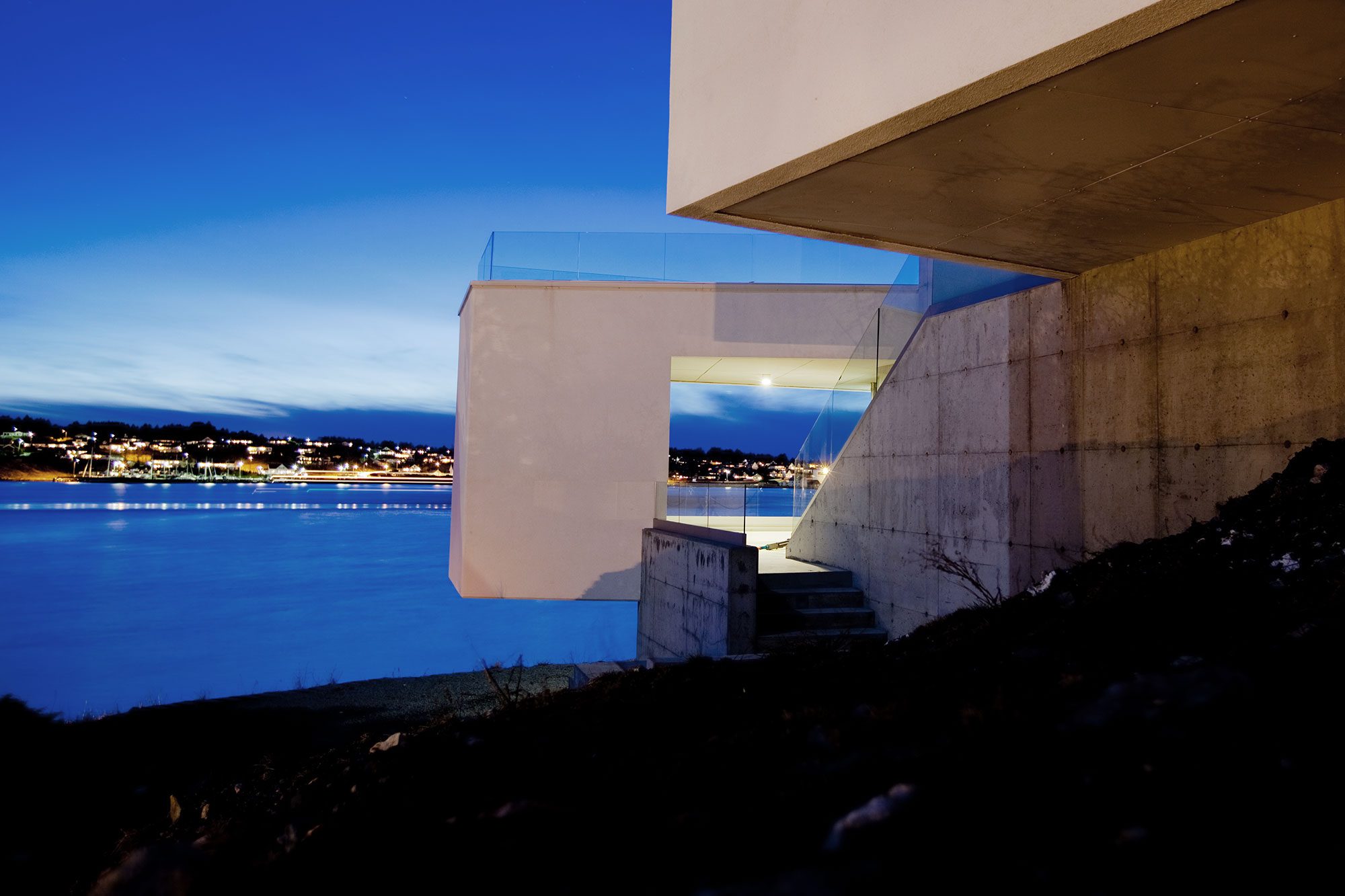 Øvre etg. er en enkel L-form som skaper et beskyttet uterom mot sør og vest. Terrenget på tomten utnyttes maksimalt ved å legge underliggende etasjer langs terrengryggen, godt inn i terrenget med store vindusflater mot vest og utsikten. Uterom er etablert rundt hele huset for å sikre gode oppholdsarealer for skiftende værforhold.